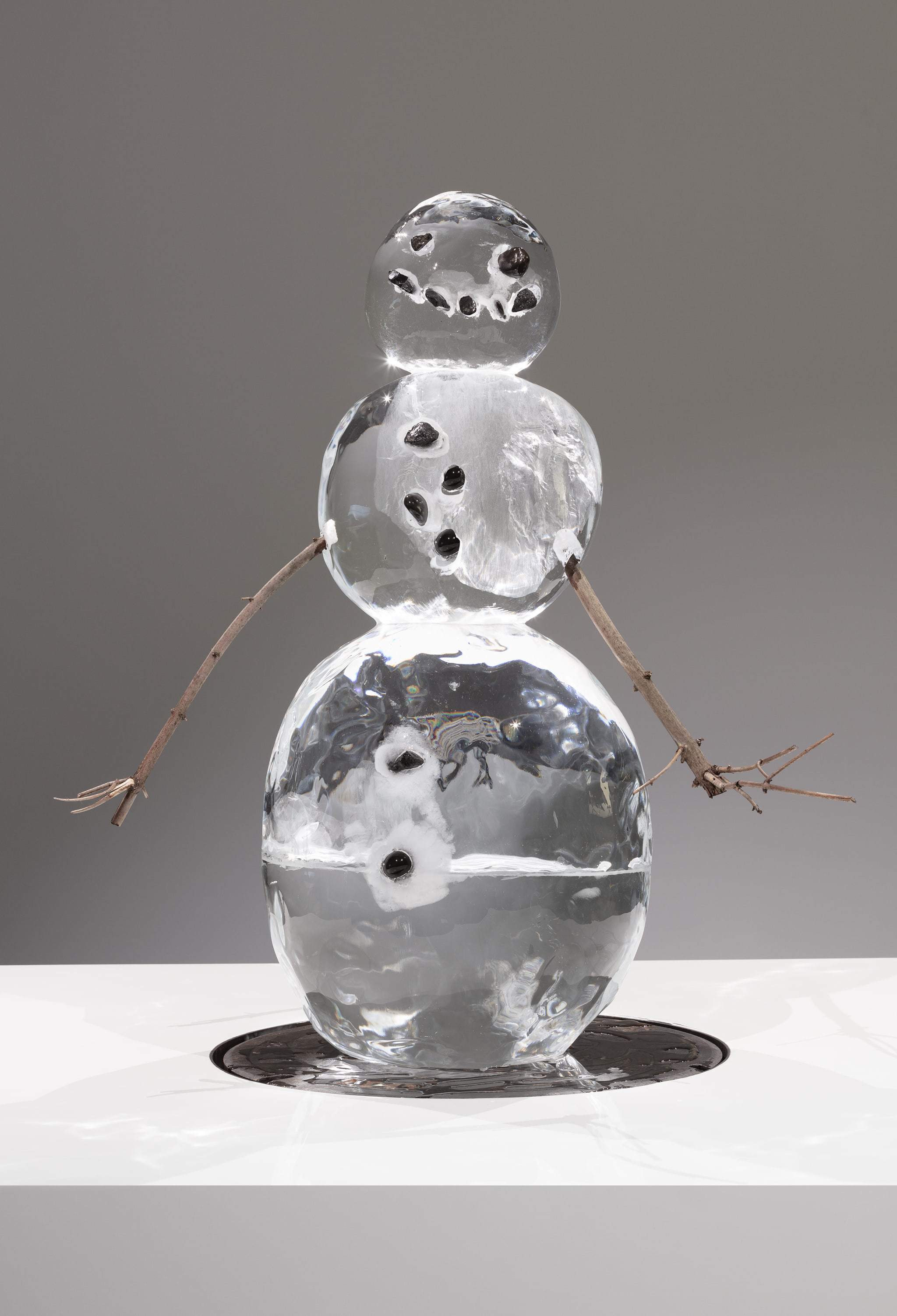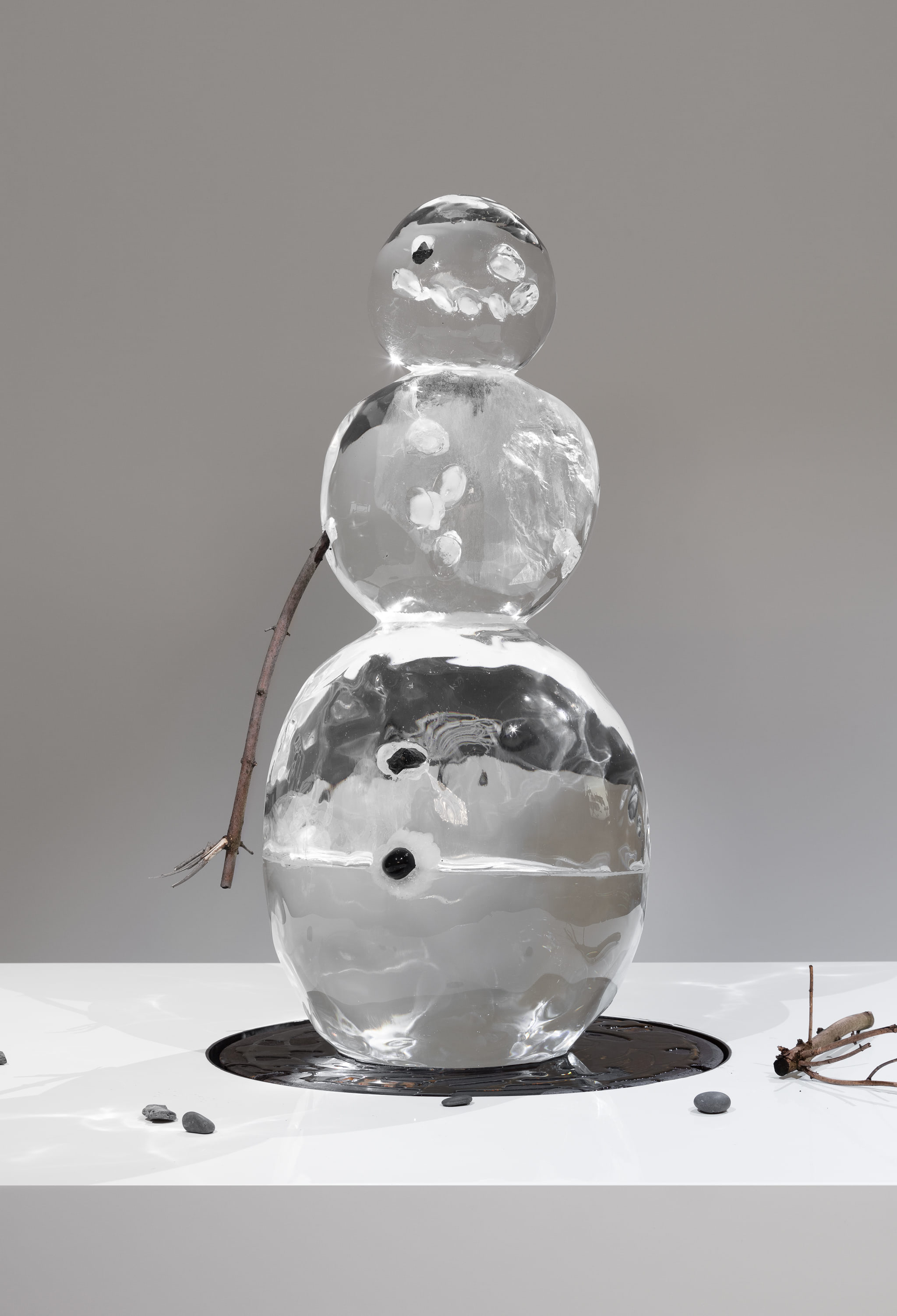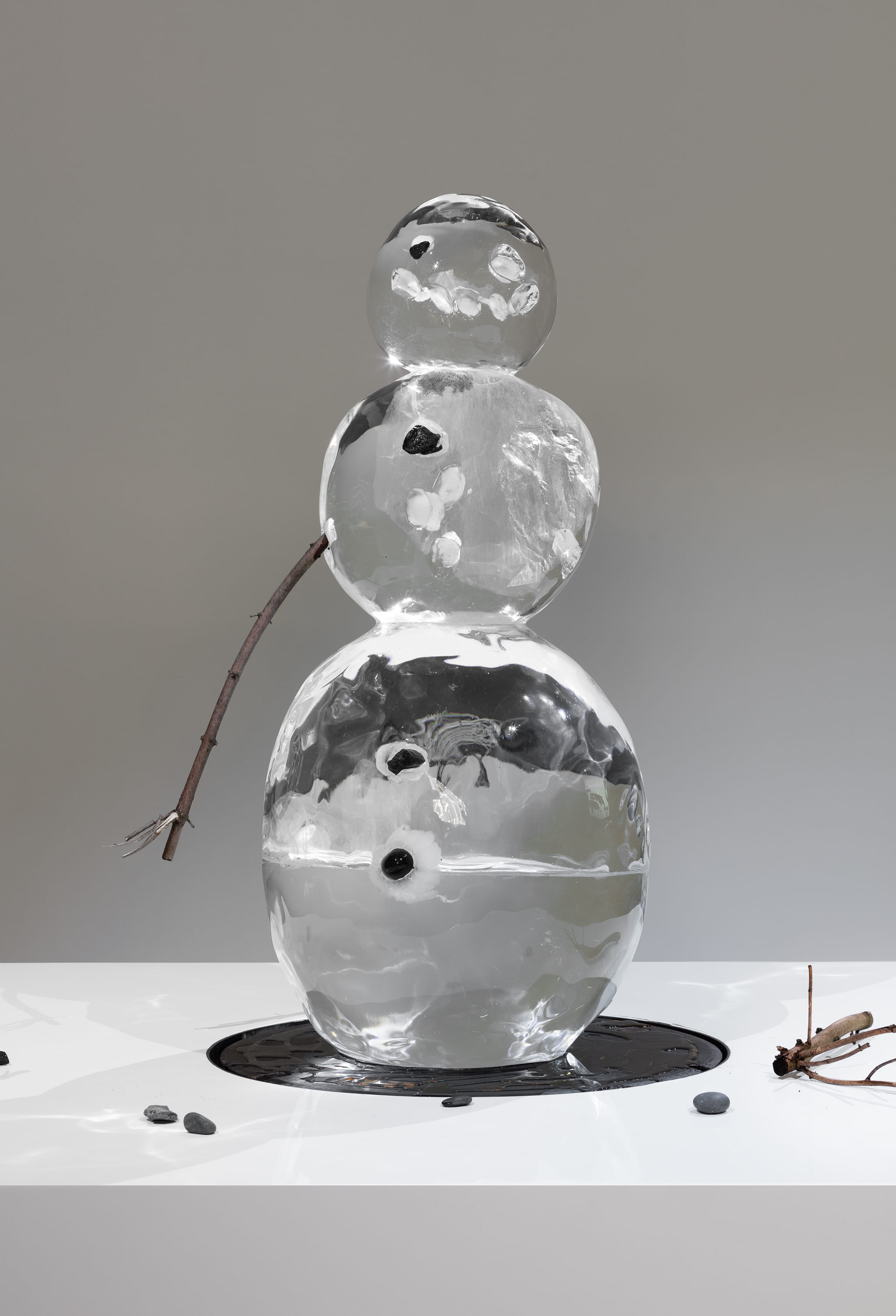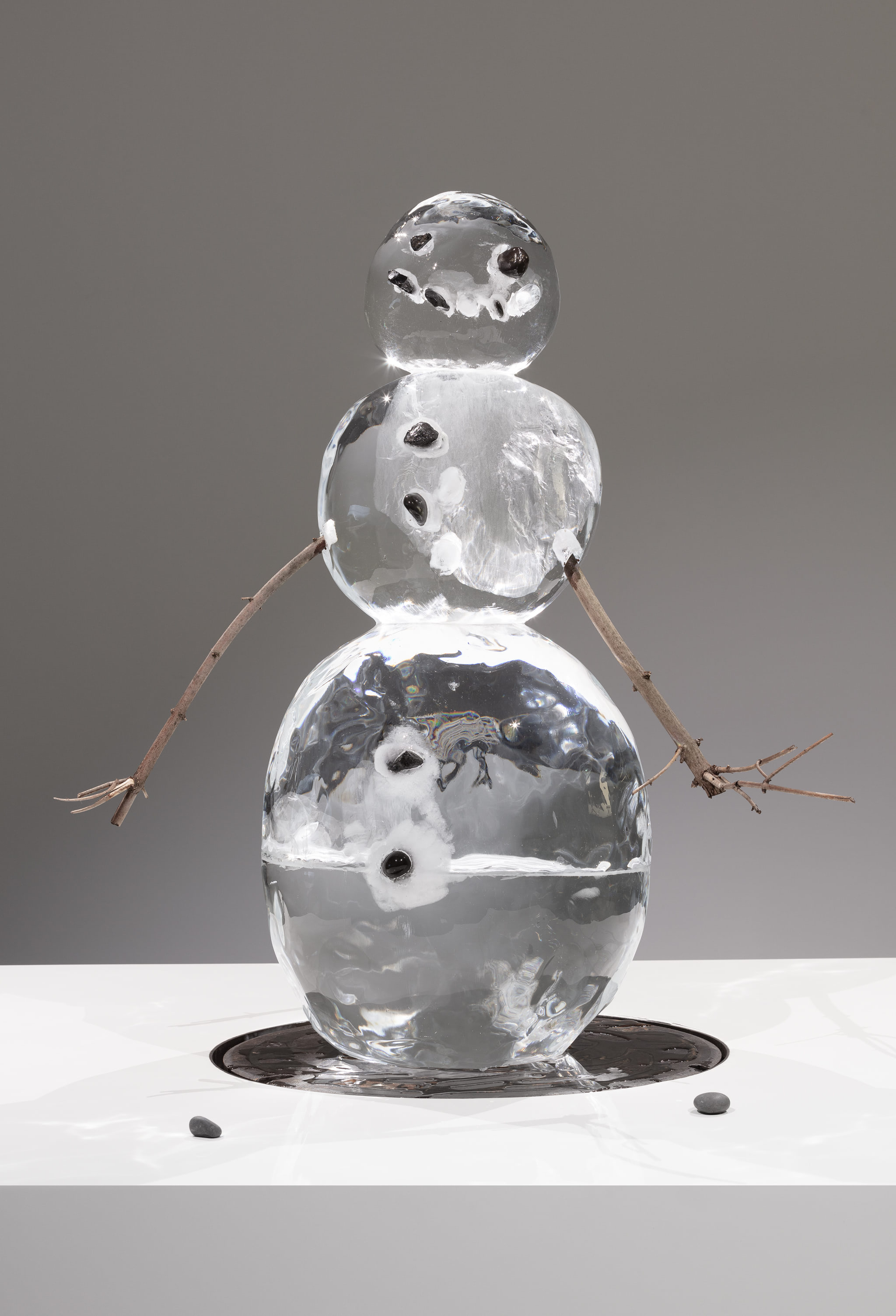 The work reappears twenty-five years later. The ice sculpture of a snowman is displayed on a plinth and melts over the course of a few days. It leaves behind the stones that were once embedded in the ice and the tree branches used for the arms. The amplified sound of dripping water echoes throughout the exhibition space.